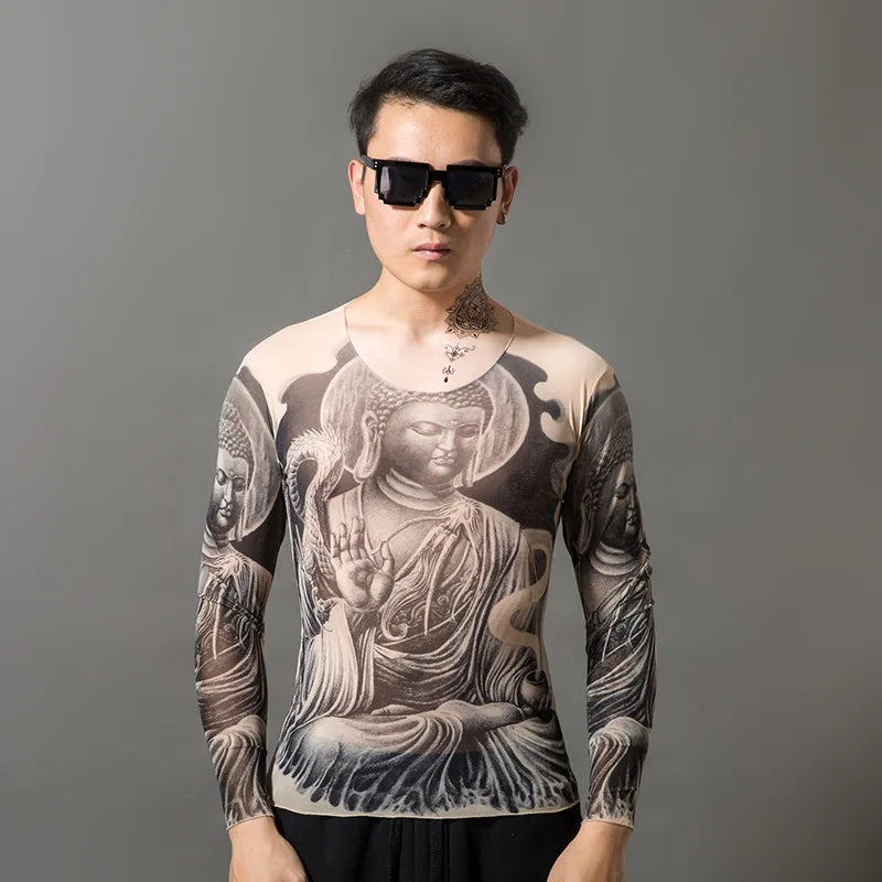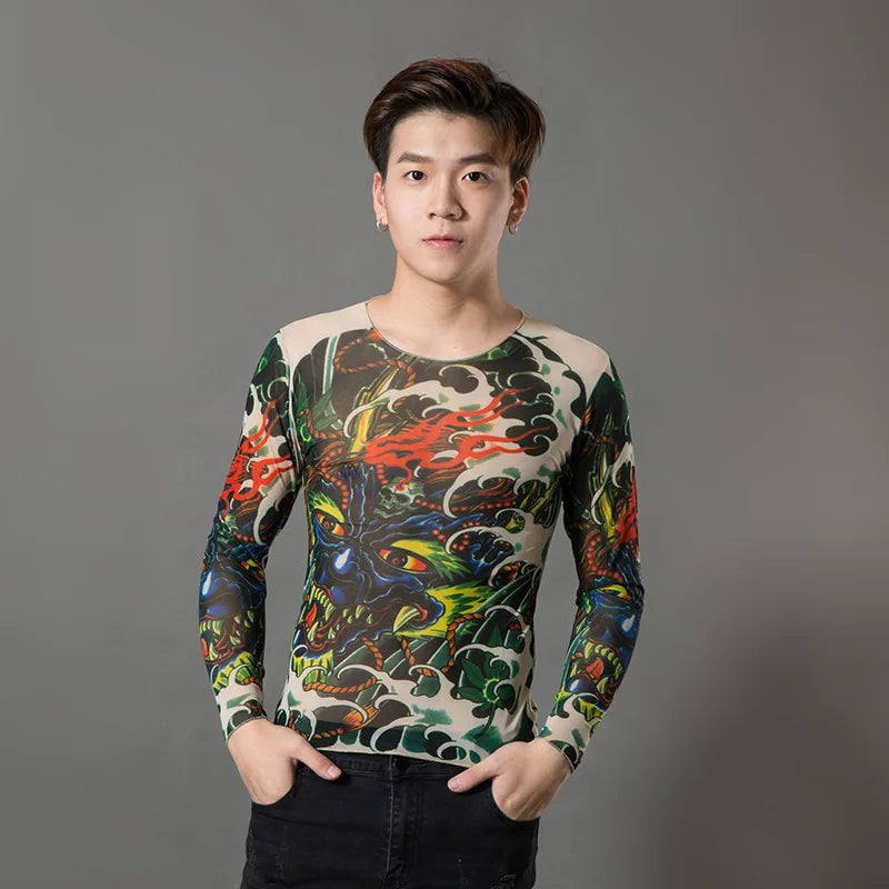 Our Fashion Men's Fake Tattoo T-shirts are crafted with long sleeves and an elastic modal fabric for a comfortable and flexible fit. The all-over print design adds a unique and fashionable touch to these O-Neck shirts. Whether for Halloween or any other event, these shirts are a must-have for any stylish wardrobe.
