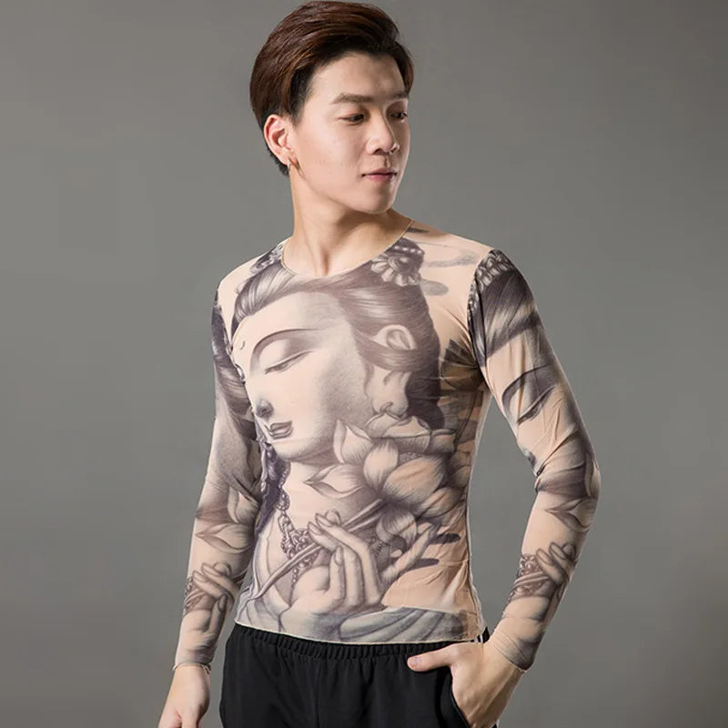 Fashion Men's Fake Tattoo T-shirts Long Sleeve Elastic Modal Thin All Over Print O-Neck Tattoo Shirts Halloween Clothing