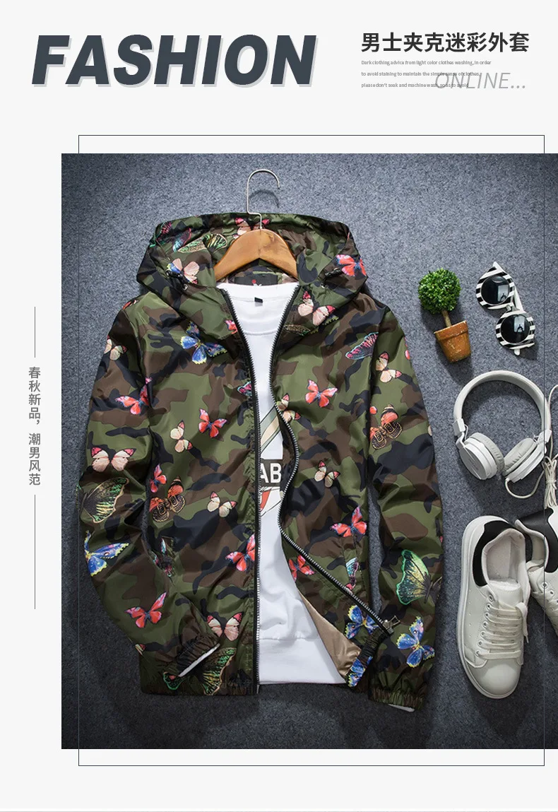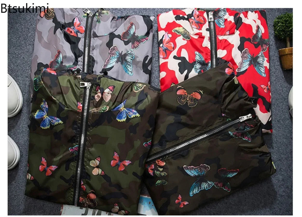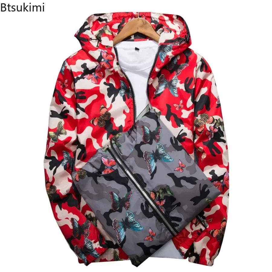 2025 Spring New Men's Camouflage Hooded Jacket Fashion Butterfly Print Loose Casual Coat Men Hood Windproof Outerwear Young Teen