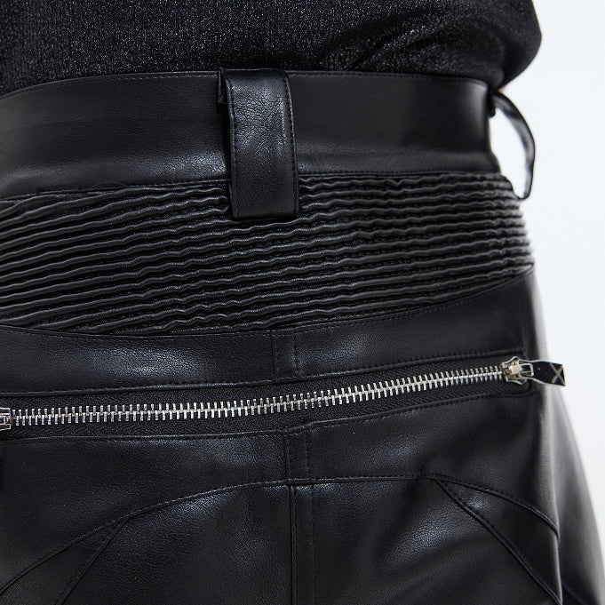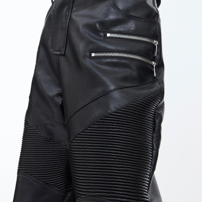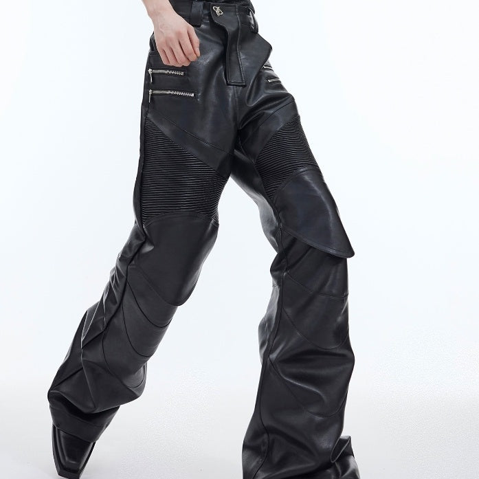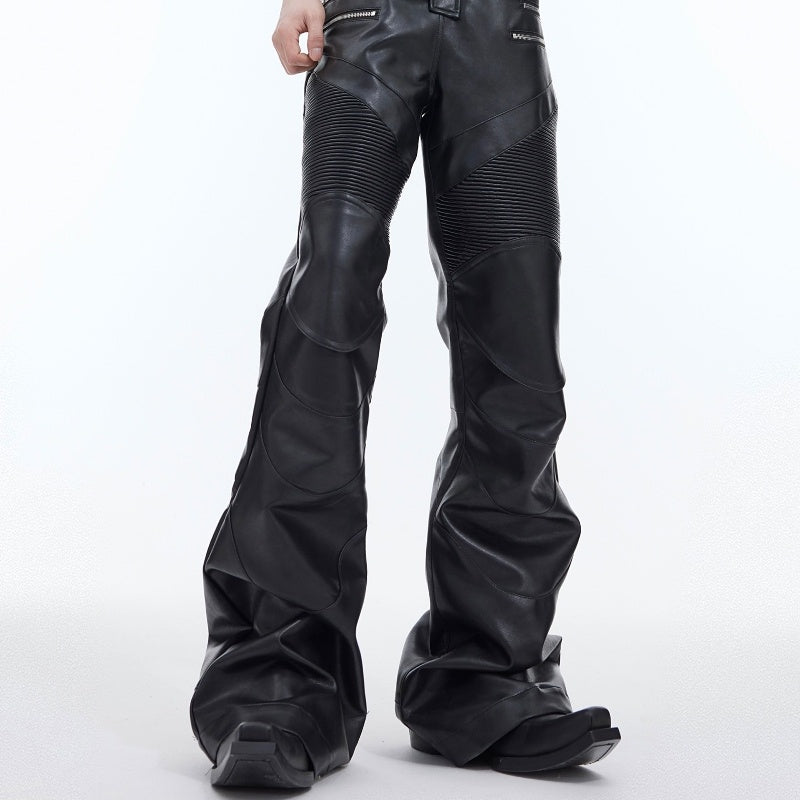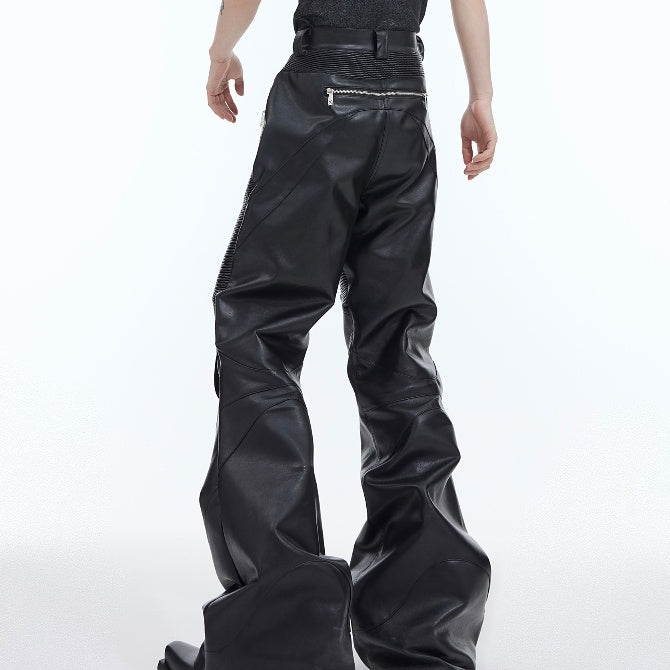 Deconstructing Three-dimensional Stitching Punk Leather Pants Metal Zipper Embellished Bootcut Casual Trousers