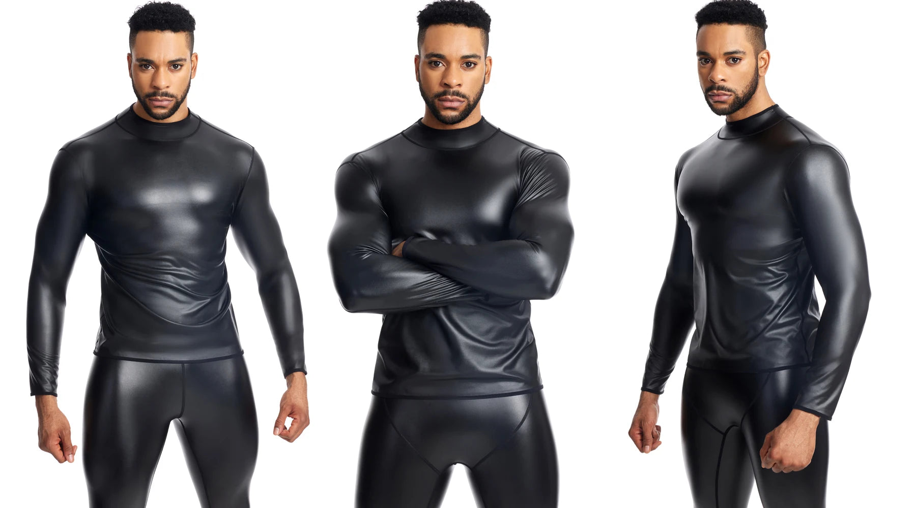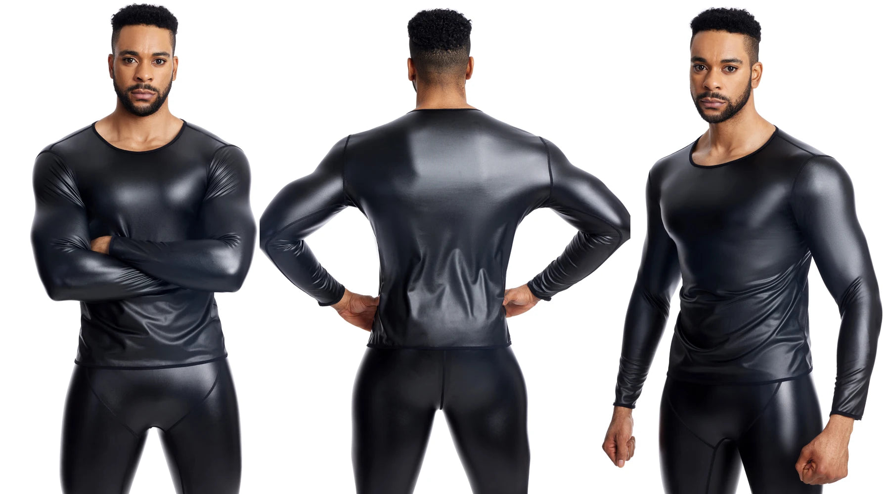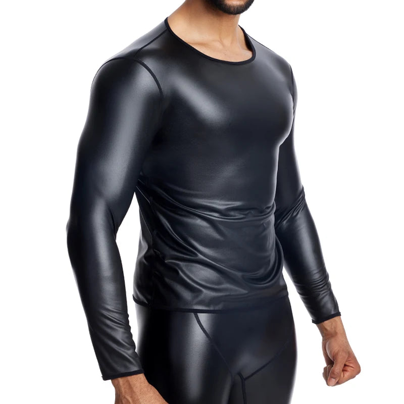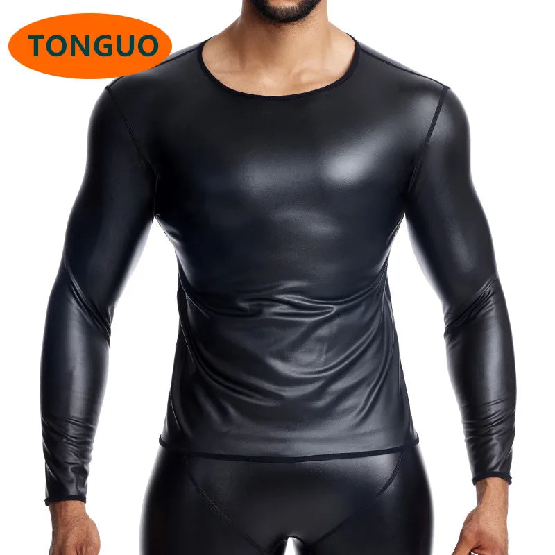 High quality Men's Leather Shirt New Men Sexy Leather T-Shirt Plus Size S-6XL Faux Leather Long Sleeve Top Black Slim Undershirt