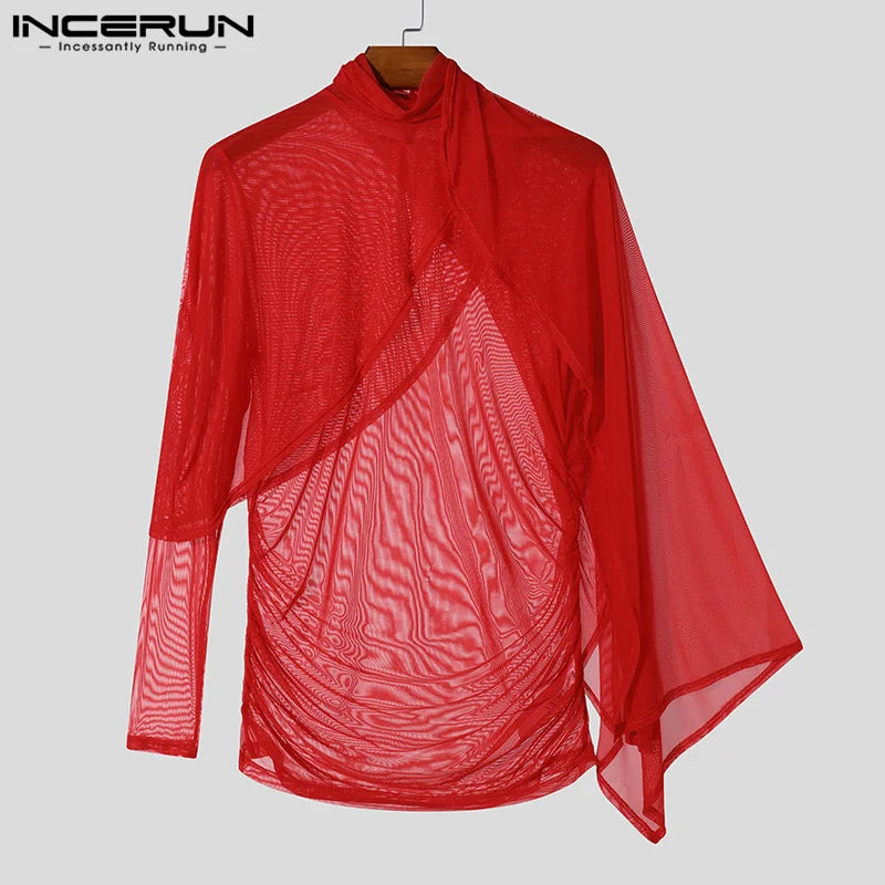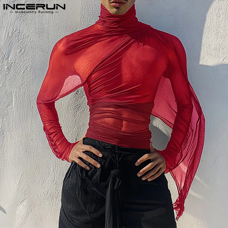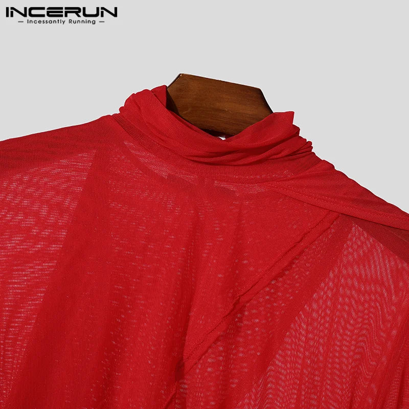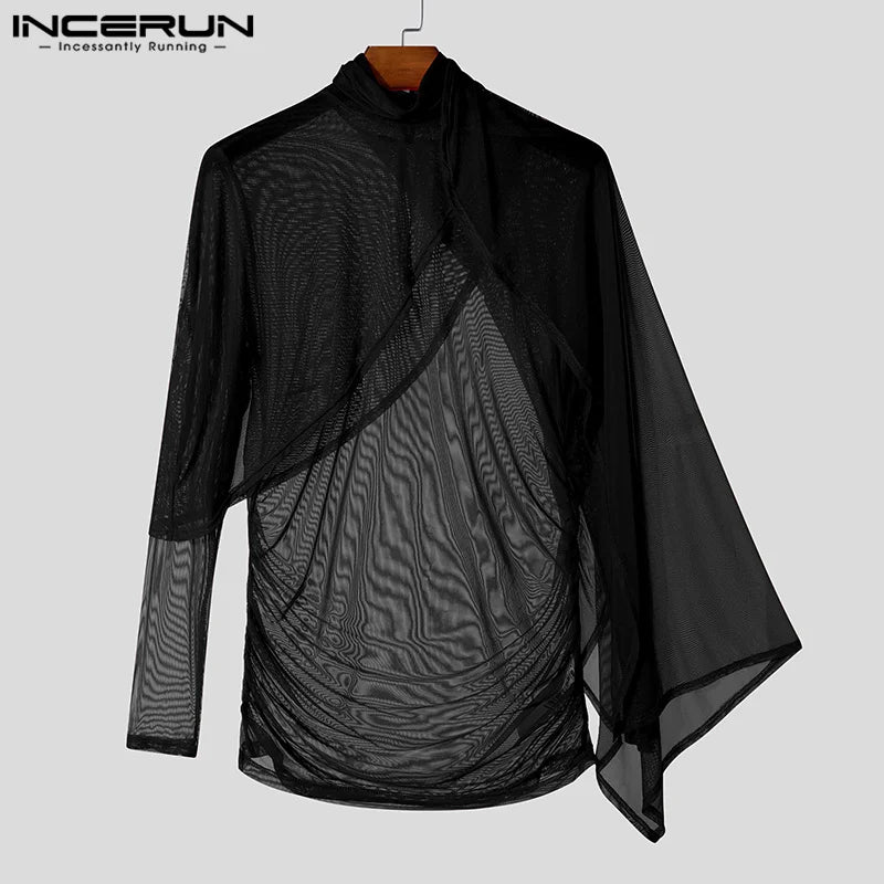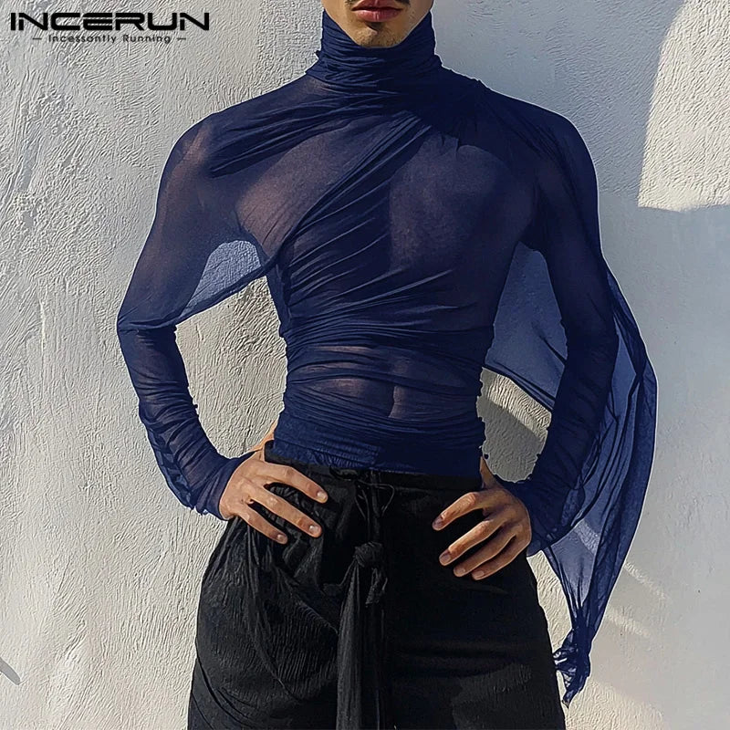 INCERUN Men See Through Solid Color Knitted T-Shirts Long Sleeve High Collar Camiseta Ruffled Edge Sexy Elegant Tops Fashion Top