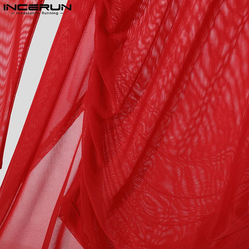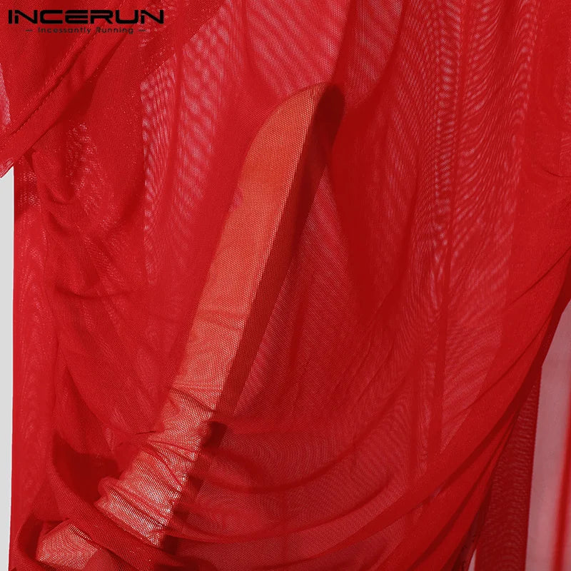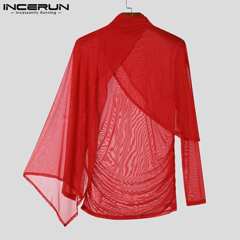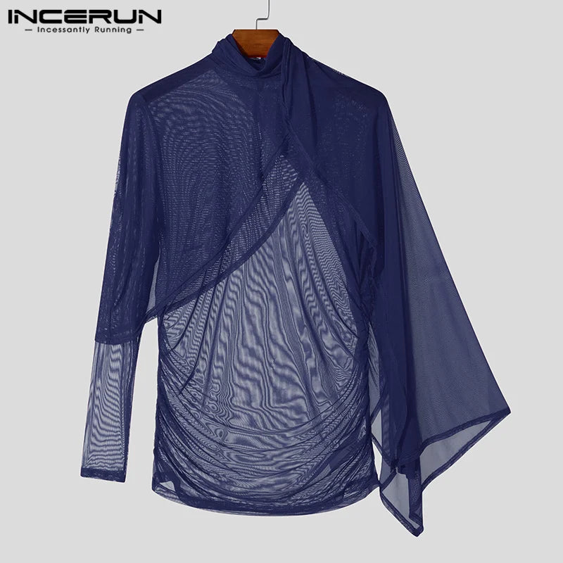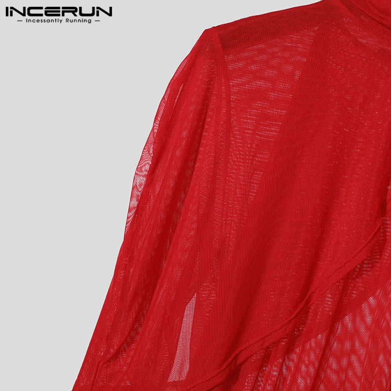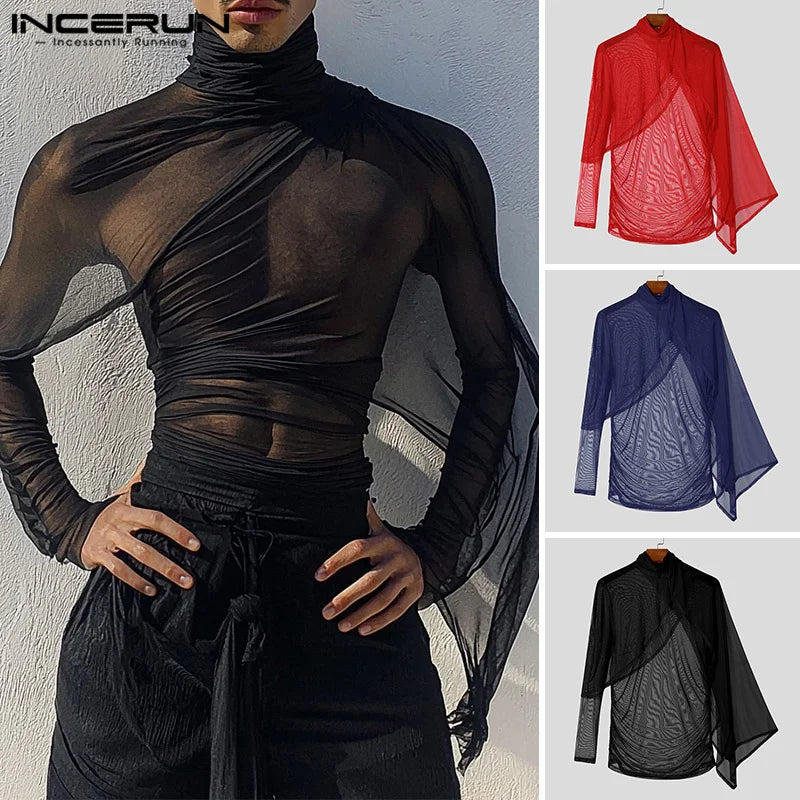 INCERUN Men See Through Solid Color Knitted T-Shirts Long Sleeve High Collar Camiseta Ruffled Edge Sexy Elegant Tops Fashion Top