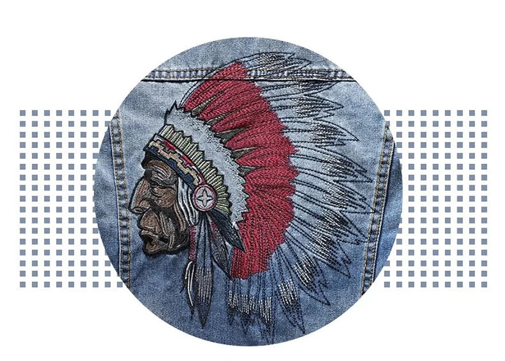 Indian Chief Embroidery Denim Jackets Men, Retro Blue Streetwear, Ripped Slim Coat, Casual Motorcycle Outwear, Spring and Autumn