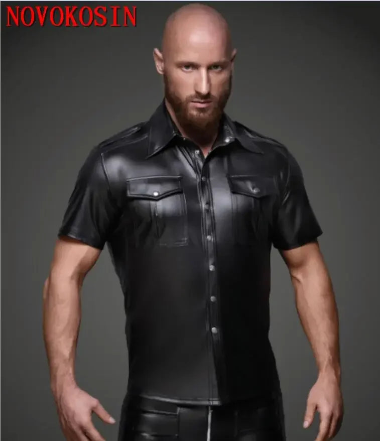 S-2XL Fashion Wet Look Black Faux Leather Men Sexy Two Pockets Tops Tees DS Night Motorcycle Short Sleeves Shirts With Button